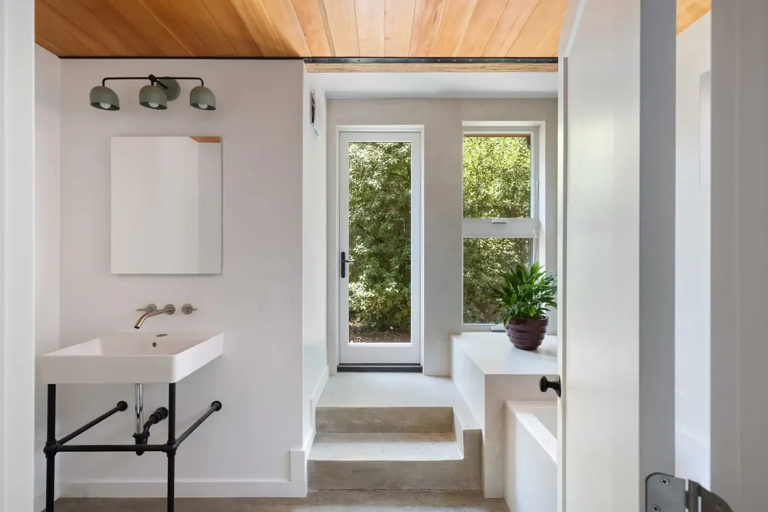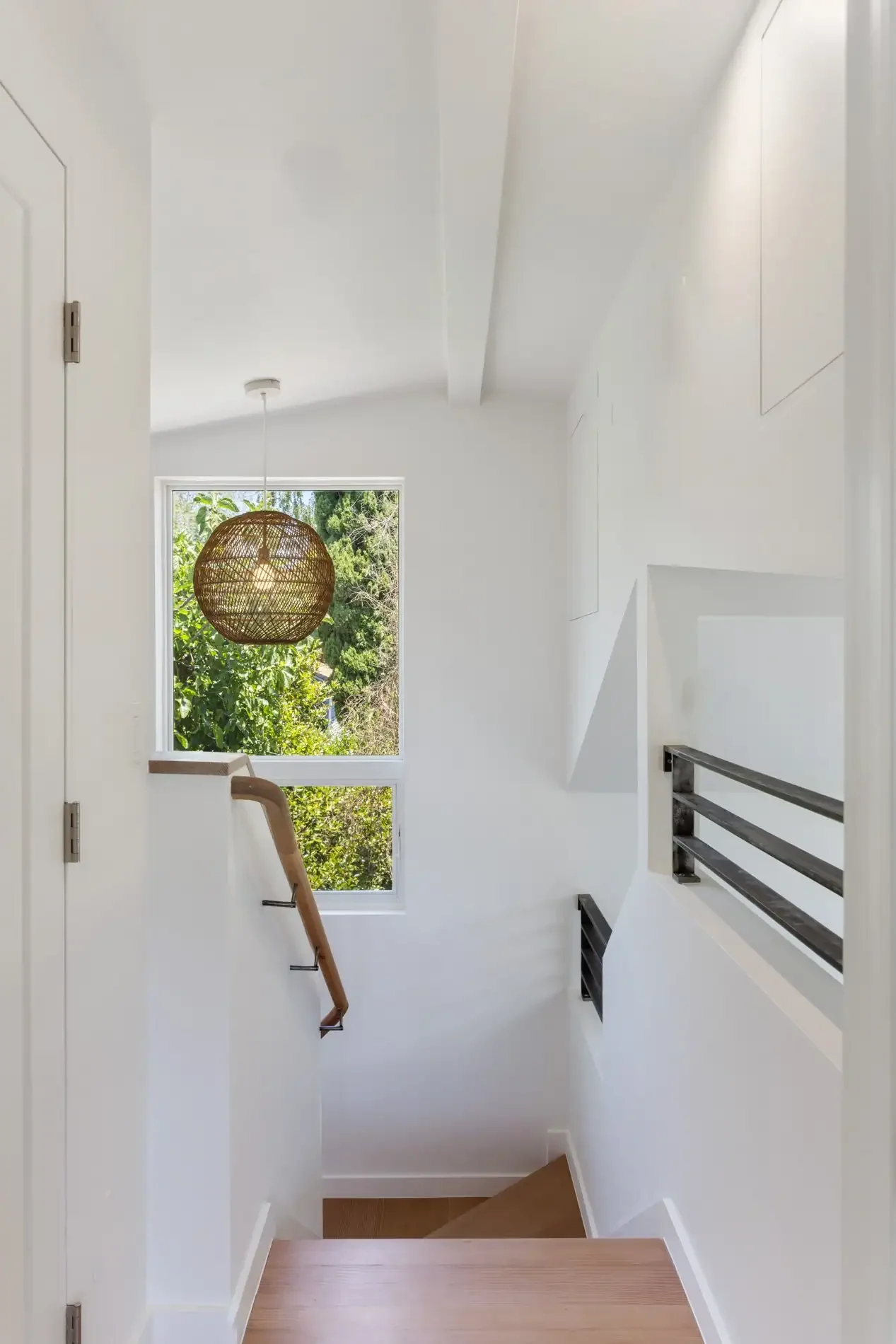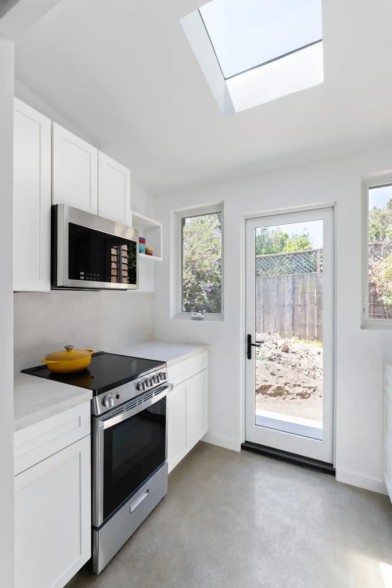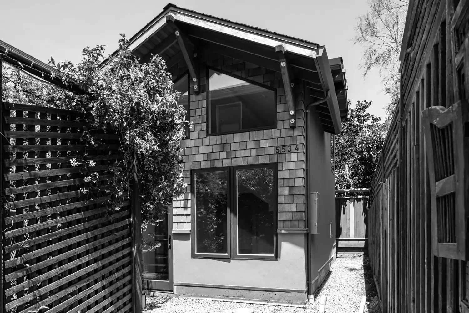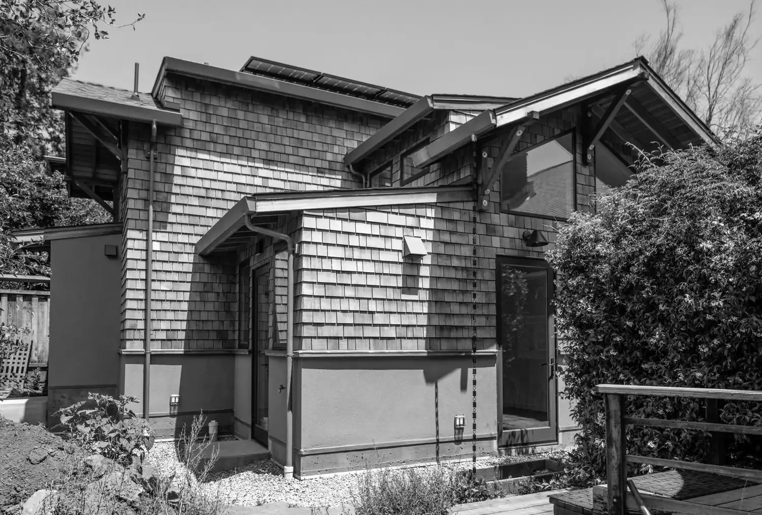 Nestled in the Zen inspired backyard of this classic Rockridge wood shingled home, the exterior style and use of wood shingles of this 680sf detached one-bedroom, two-story ADU mirror the main home. The interiors take a contemporary turn with high ceilings,custom windows that modulate natural light, built-in shelving and hand-crafted staircase bannister. Designed to be highly energy efficient, it is super insulated, all electric and built with FSC certified lumber. A solar array provides solar electricity for both the ADU and the home.