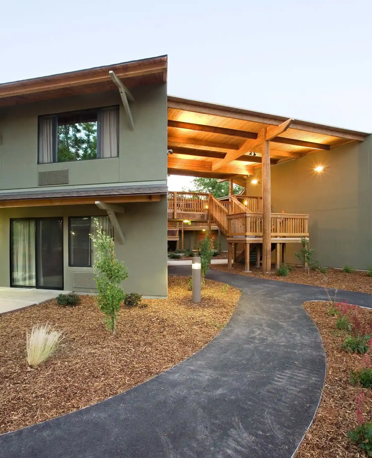 The Gaia Anderson's more than 100 green features include solar electric systems, daylight in every space, passive heating and cooling strategies, preservation of existing shade trees to decrease heat islands in the parking lot, high-performance insulation, a lagoon that provides habitats for native aquatic birds, an ozone laundry system, high-efficiency Mitsubishi "Citi-Multi" HVAC systems, FSC-certified wood, dual-flush toilets and waterless urinals, and zero-VOC (volatile organic compound) finishes.